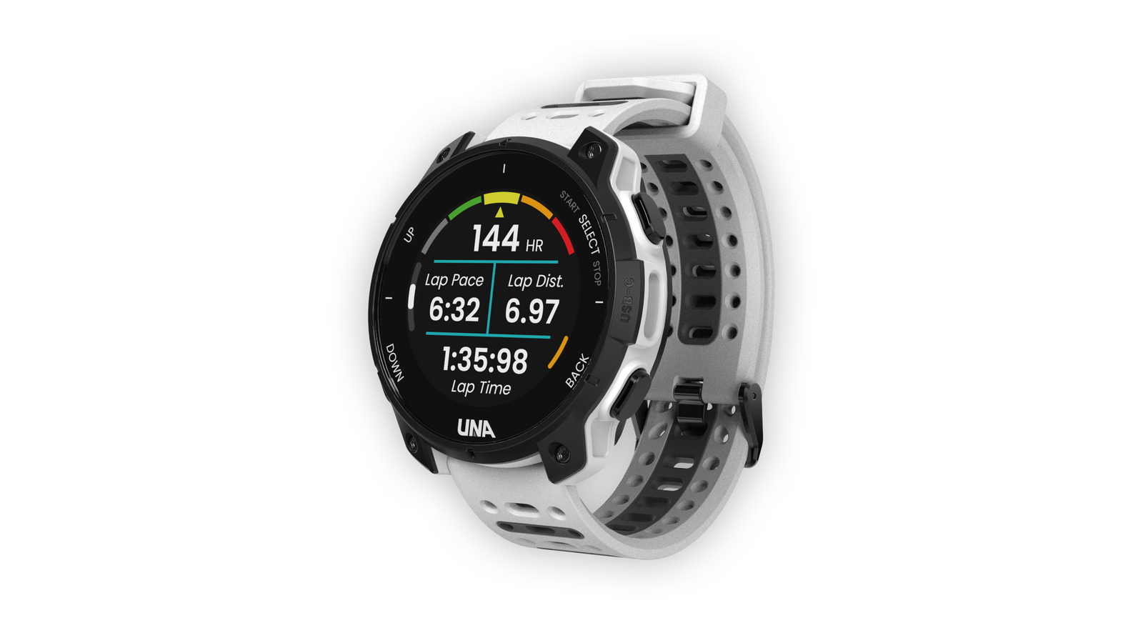 By utilising the latest sensor technology, UNA supports you in achieving your performance goals. Whether that's in cities or the mountains, UNA will be with you every step of the way. Metrics include Daily Steps, Floors, Daily Activity Minutes, Average, Resting & Current HR, and SpO2 Max.